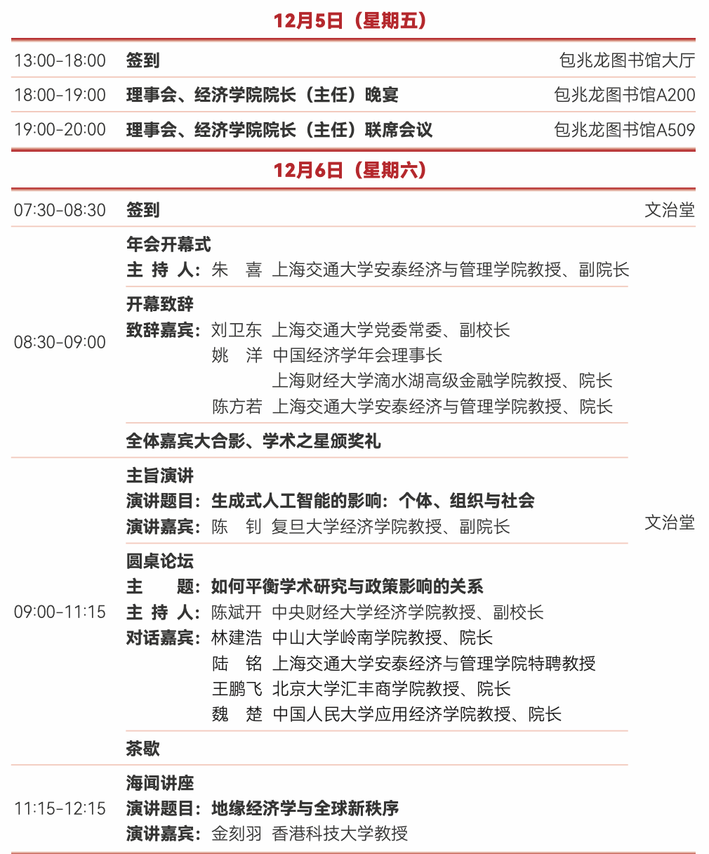 返回第二十五届中国经济学年会将于2025年12月5日至7日在上海交通大学徐汇校区举办。