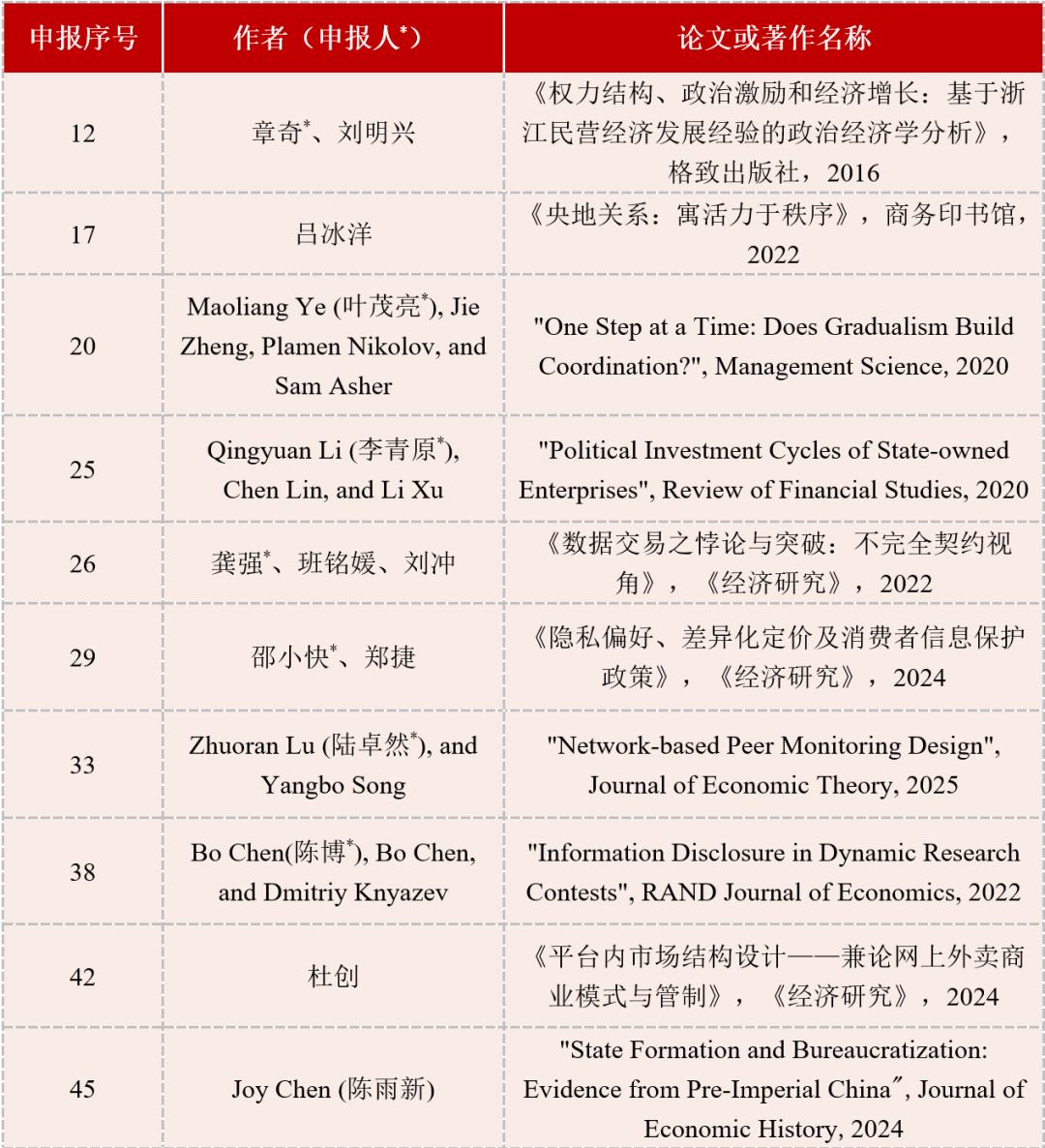 为了推动中国组织经济学的研究发展和人才培养,中国人民大学“杨瑞龙经济学基金”支持设立了“杨瑞龙组织经济学研究奖”。2025年6月发布评奖公告后,收到了许多申报作品,为此感谢社会各界的关心和支持。经过中国人民大学经济学院评审工作小组的初筛、外部专家的匿名评审,根据评分确定了下列入围成果名单(按申报序号排列),现予以公告。之后,评审委员会将以无记名投票的方式,从中择优评出最终获奖作品,并在2026年中国组织经济学研讨会召开期间举行颁奖仪式。